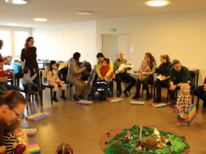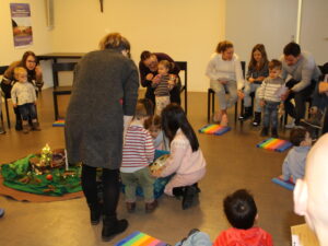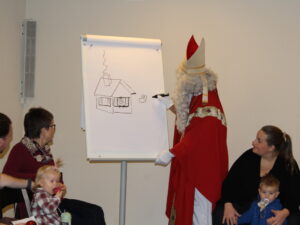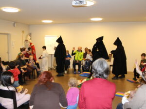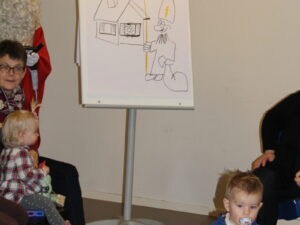 Erzählt wurde die Geschichte «Stand uf, Sibeschlööfer, de Samichlaus isch da!» Dann kam der Samichlaus zur Türe herein. Gemeinsam mit dem Schmutzli hat er ein Pantomimen Spiel gemacht und gezeichnet, wie die Kinder auf den Samichlaus warten. Am Ende haben alle Kinder einen Grittibänz bekommen. Hier ein paar bildliche Eindrücke von diesem besonderen Anlass für kleine Kinder: