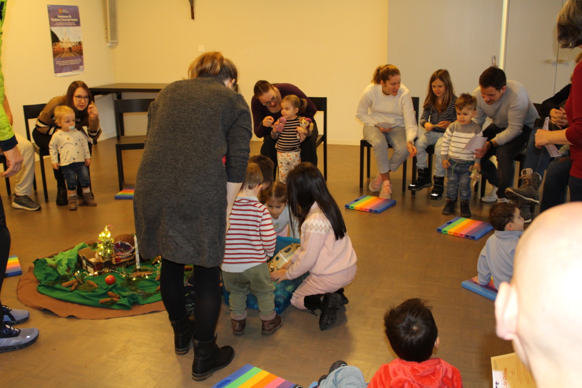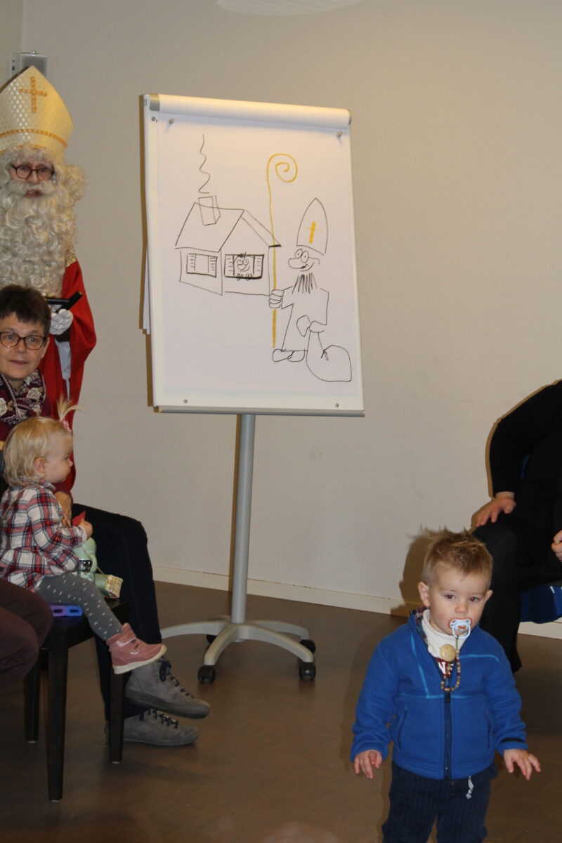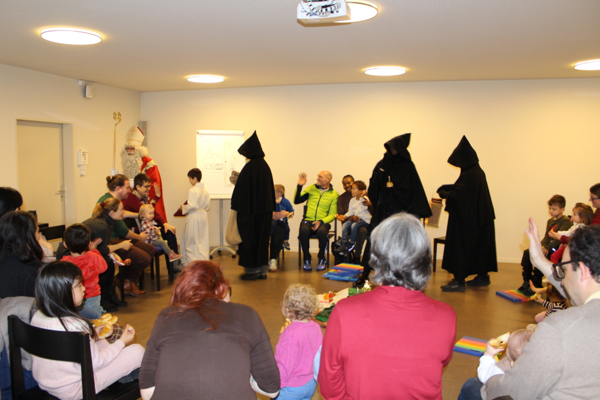 Erzählt wurde die Geschichte «Stand uf, Sibeschlööfer, de Samichlaus isch da!» Dann kam der Samichlaus zur Türe herein. Gemeinsam mit dem Schmutzli hat er ein Pantomimen Spiel gemacht und gezeichnet, wie die Kinder auf den Samichlaus warten. Am Ende haben alle Kinder einen Grittibänz bekommen. Hier ein paar bildliche Eindrücke von diesem besonderen Anlass für kleine Kinder: