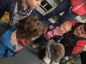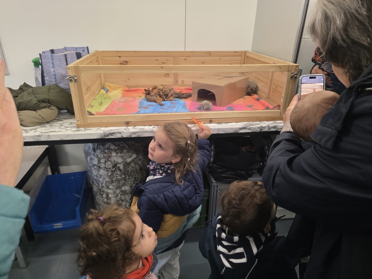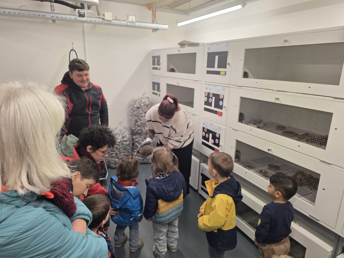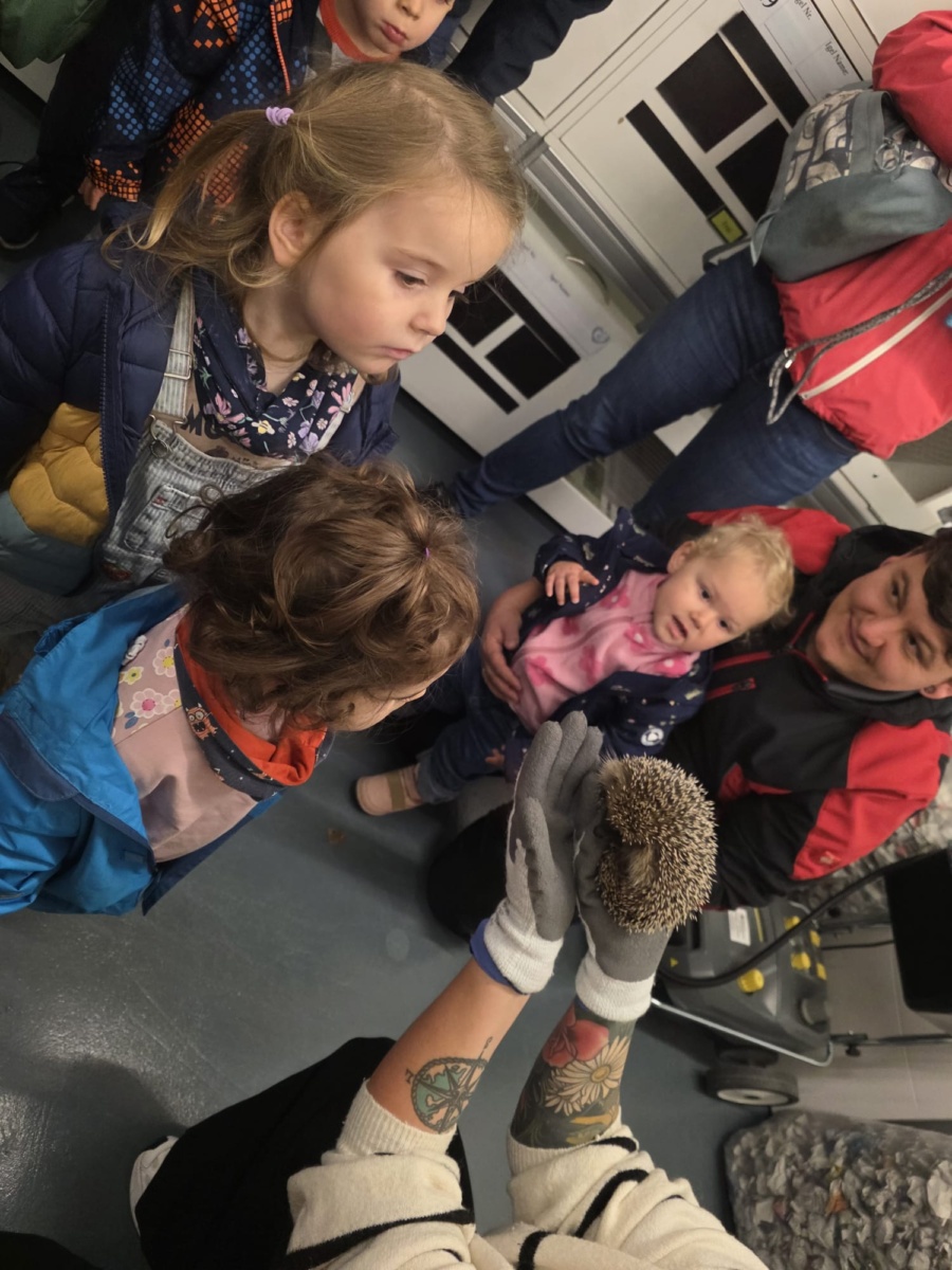 Im Anschluss besuchten die Kinder die Igelstation im Satis. Dort werden schwache oder junge Igel gepflegt und für den Winterschlaf vorbereitet. Der Besuch war für die Kinder ein besonderes Highlight – mit grossen Augen verfolgten sie, wie die Igel gefüttert und umsorgt wurden. Viele Fragen wurden gestellt, und das Staunen war gross.