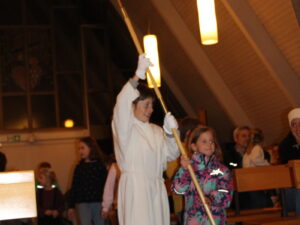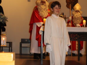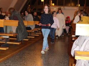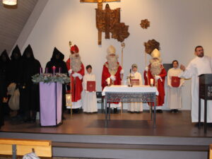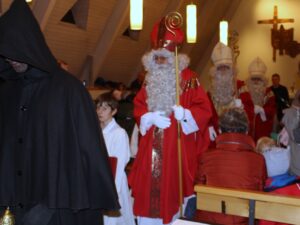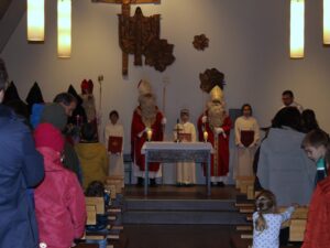 Die Feier war sehr spielerisch gestaltet. Von den drei Nikoläusen hatte jeder etwas nicht dabei, da er es im Vorfeld scheinbar nicht mehr gefunden hatte. Der eine Nikolaus hatte keine Mitra, der andere keinen Stab und der dritte kein Buch. So durften die Kinder raten, welcher Samichlaus welches wichtige Utensil nicht dabei hatte, und gingen es jeweils mit dem zuständigen Diener in der Kirche suchen. Für die Kinder war das ein herrliches Spiel, an dem sie sich gerne beteiligten.